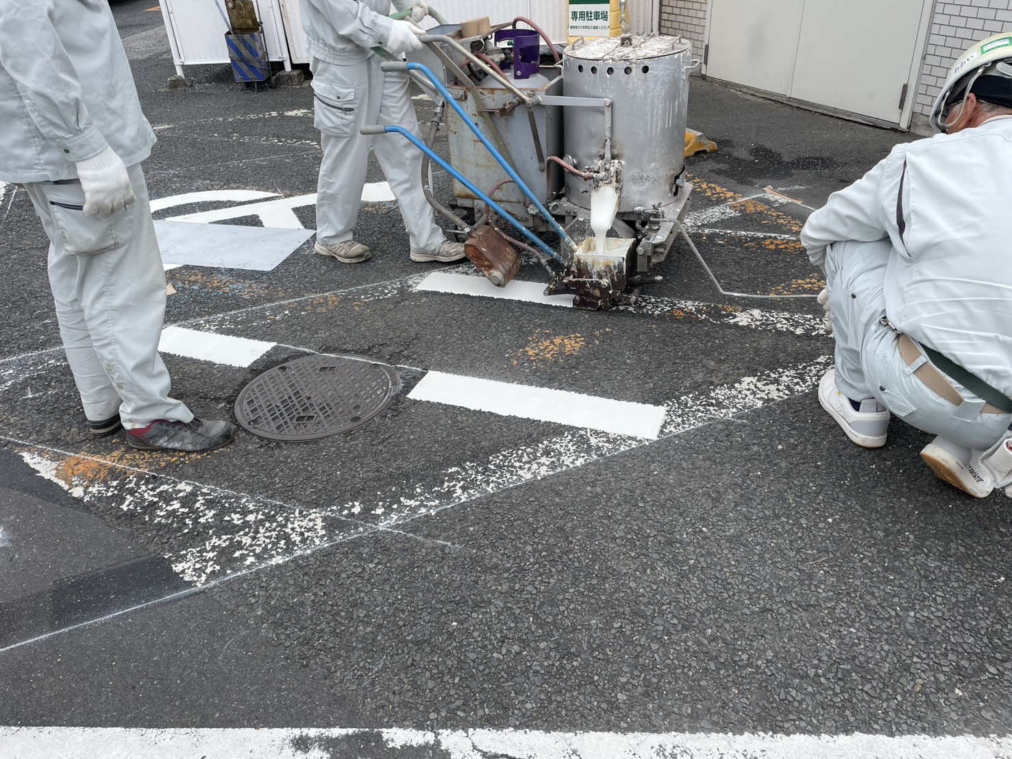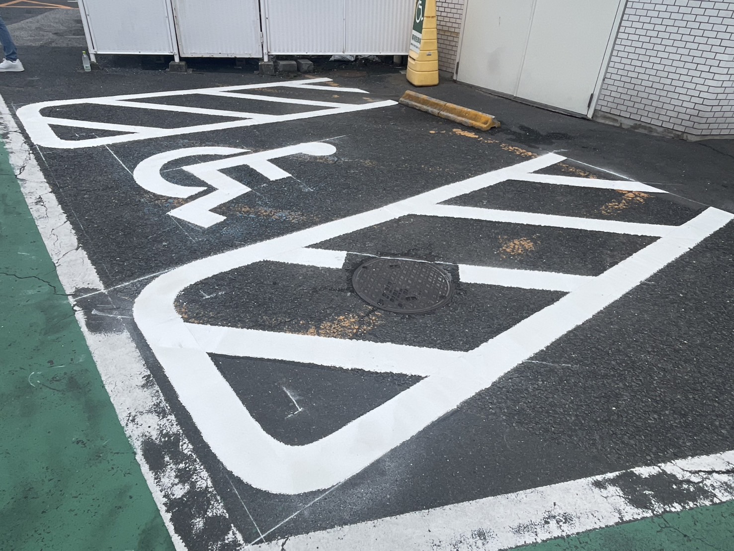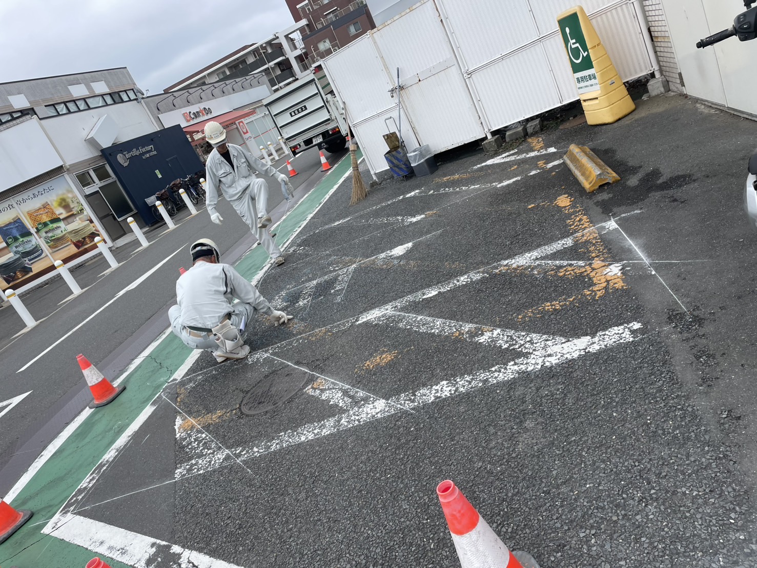 今回、商業施設の駐車場にて白線ライン引き・車イスマーク(身障者スペース)区画塗装工事を行いました。