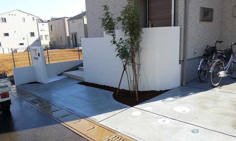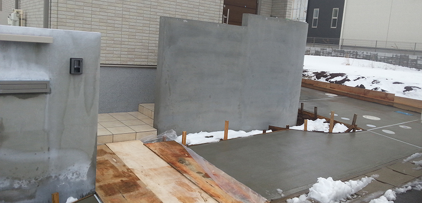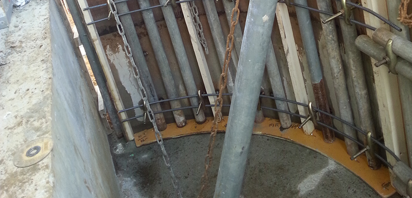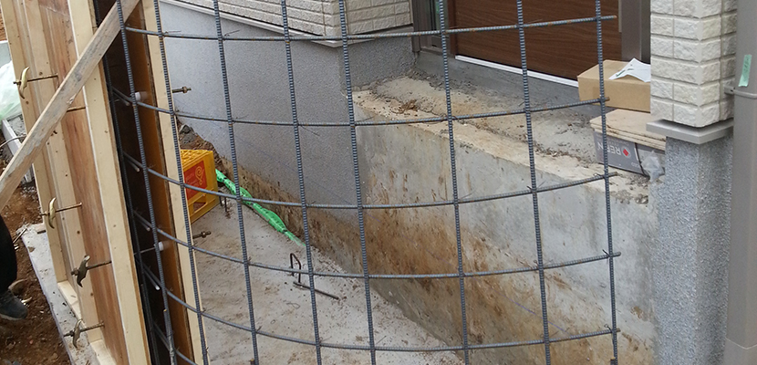 生コンクリート打ち込みに対する枠抑えをしている様子です。形がアールなので、補強が大事です。